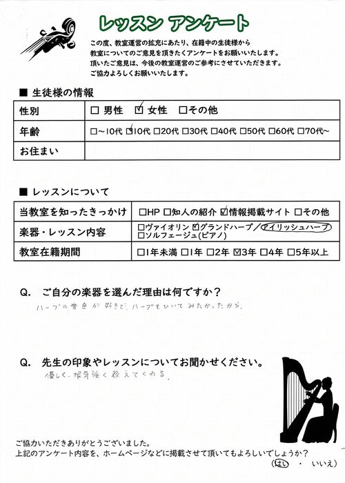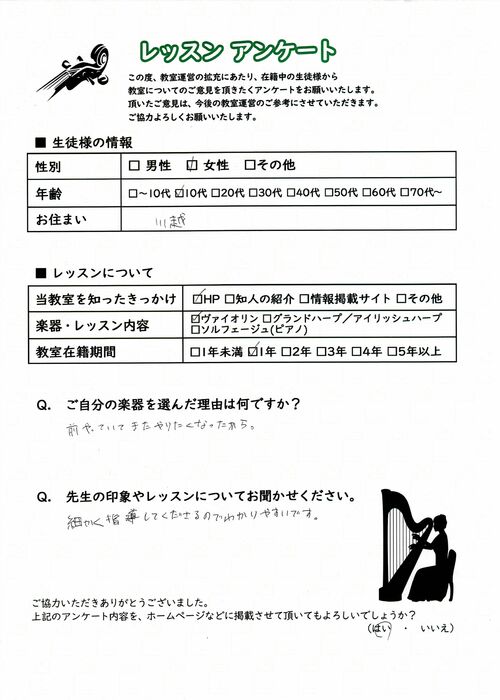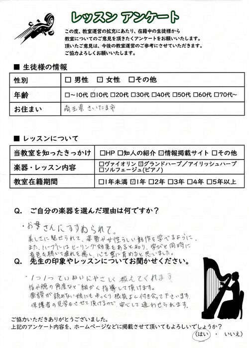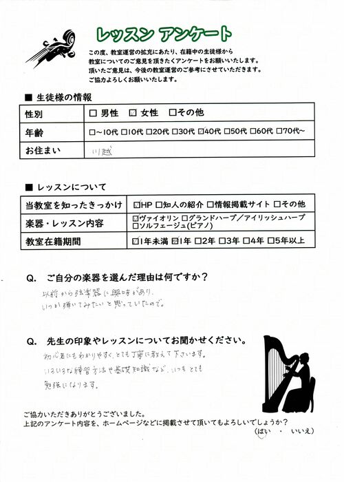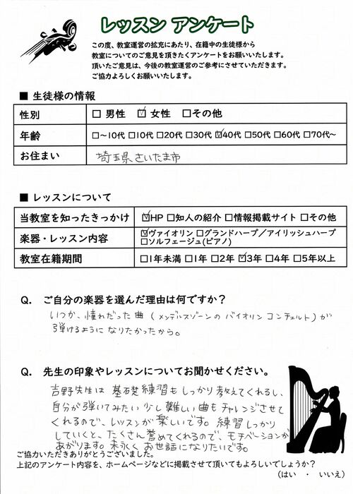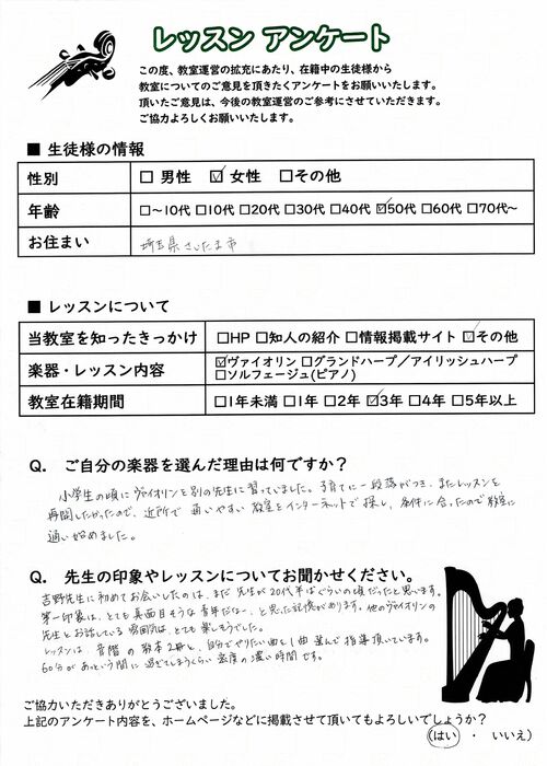 初めての習い事や、大人の趣味としても気軽に通っていただける埼玉のヴァイオリン教室として、着実に実績を積んでおります。ヴァイオリン以外にもハープやソルフェージュのレッスンを行っており、生徒様からは「指導が分かりやすく、安心してレッスンに通える」「もっと早くヴァイオリンを始めれば良かった」「ハープを習うようになってから気持ちが落ち着く」「子供の教育に最適」など、喜びのお声を数多く頂戴してまいりました。